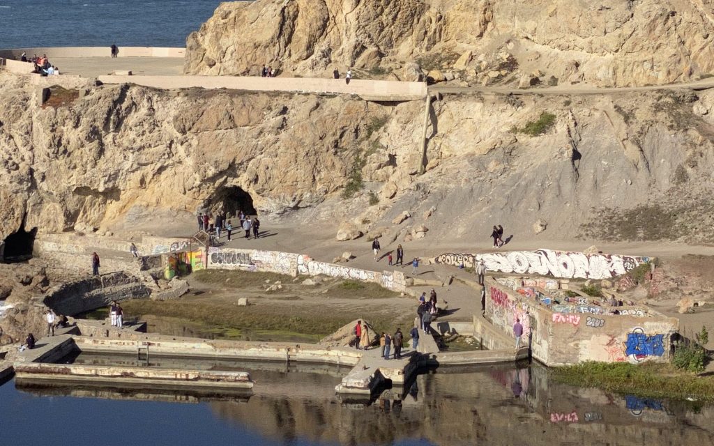I am fascinated by the history of Sutro Baths. It used to be a glamorous bathhouse (with seven swimming pools) that Adolph Sutro made for the public in the 1900s. What I didn’t know is that it was an all-around attraction: it had restaurants, a museum, music performances, and more. Now, its facade has eroded to pools of water enclosed by crumbling walls, walkable bridges, exposed pipes, and lots of graffiti. It’s just nature and people doing their thing.