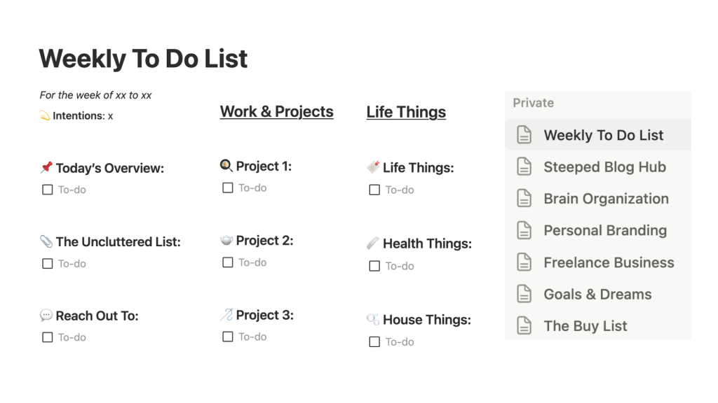I started using Notion last year but didn’t fully commit to it. Now, I use it more often to jot down miscellaneous and higher level tasks. Additional organizing lists are also documented on different pages, from my blog to brain dump. The key, for me, is to use it in conjunction with my project To Do Lists (Google Docs with organized tabs that is shared with each founder/team I work with), and on a more weekly / flexible basis. I’ll often organize things by priority or plan out what projects I should focus on for each day.